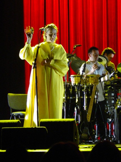 乐队在强烈的欢呼和鼓掌中登场的时候,台上呈现一片明亮的橘红色。六个人,Lisa Gerrard身着白色长裙站在正中的讲坛后面,讲坛上放着扬琴。对,就是那种中国扬琴。Brendan Perry身上挂着吉他,手执一个小鼓。另外两个鼓手淹没在各式各样大大小小的鼓后面,占了一半的场地。最后是贝斯手和键盘/合成器。看来他们要在合成器和真鼓的领导下,复原唱片里谨慎细致的声音场景。